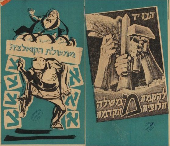 בכרזה זו ניתן לראות בחלקה העליון את הפועלים הסוציאליסטים ובחלק התחתון השמאלי מופיעה דמותו של נציג מפלגת הציונים הכלליים, עם האות "צ". הוא אינו דומה לאיש ממנהיגי המפלגה אלא הוא בן דמותו של אותו ברון דה רוזנפלד מהכרזות הצרפתיות. נציג הציונים הכלליים מופיע במלוא חמדנותו, כאשר מי שמתיימרים לייצג את מפלגות השמאל, מפא"י ואחדות העבודה, משתפים איתו פעולה. המסר איננו אנטי יהודי, אלא לוקח את הדימוי האנטישמי ויוצר לו דימוי חדש – של יהודי גלותי. בעוד שהפועלים הסוציאליסטים הם הייצוג של "היהודי החדש" – האדם שבונה את ארצו במו ידיו, הרי שהציונים הכלליים מייצגים את היהודי הישן והגלותי, "הספסר" כפי שנכתב במודעה.